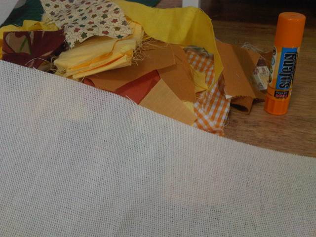 Busqué un liencillo que me sirviera de base y corté las tres franjas para la bandera... Nota: La próxima vez uso otra tela de base. El liencillo deshilacha demasiado.